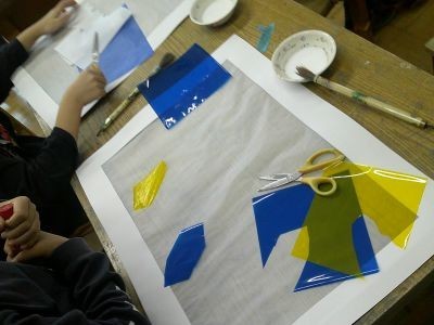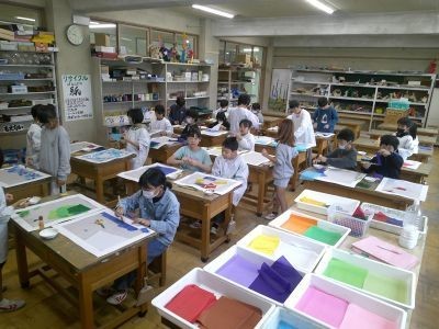 障子のように透ける紙の上にセロハンや花紙を切るなどして貼り付けると光が透けてきれいに見えます。サンプルの作品を見ると、子どもたちから「おー」っと声があがっていました。4年生の図工です。どんなふうに光がとおって見えるかを考えながら取り組んでいました。