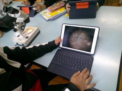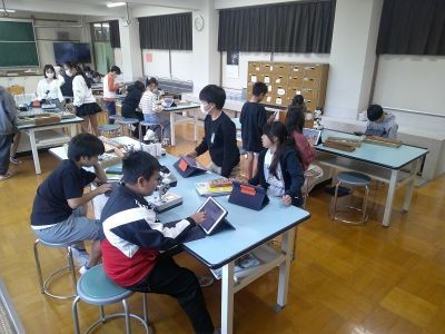 6年生の理科。さまざまな石などを顕微鏡で拡大してどういう様子か調べていました。顕微鏡の接眼部分に端末のカメラをあて、写真に撮ってその画像から詳しく調べている子もいました。