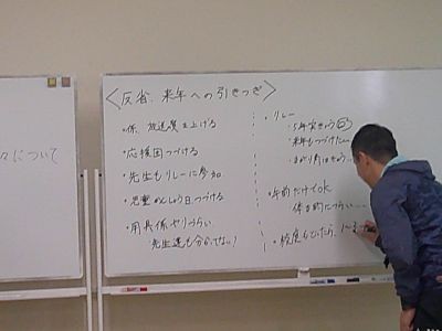 休み時間、スポーツフェスティバルの実行委員を務めた6年生が集まり、反省と次年度への引継ぎをまとめていました。応援団、授業鑑賞日、6年のリレーなどは続けたい。係のやり方などは改善した方がいい、広い校庭になったら学年合同の取組なども増やしてはなどの声が聞かれていました。子どもたちの声を踏まえつつ、来年度、そしてその先のあり方を考えていきます。
