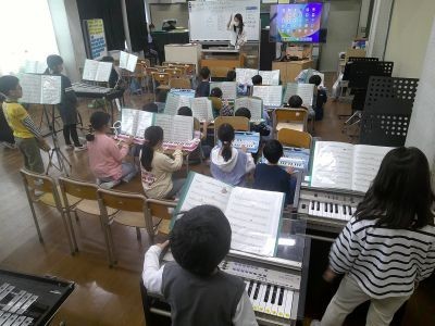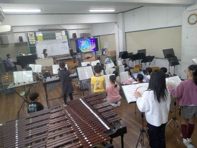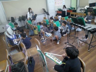 3年生の音楽。「情熱大陸」という曲を個別に、楽器ごとに練習してきました。それをみんなで合わせてみようという段階。微妙にズレたり曖昧になったりしているところを確認して、さらに練習を重ねていました。