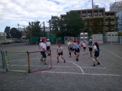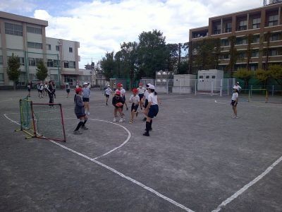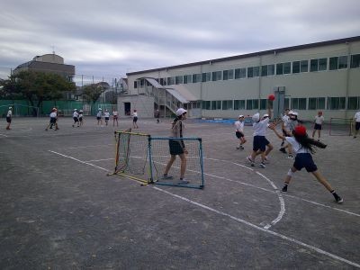 5年生の体育。校庭で簡易なハンドボールを行っていました。相手がいないスペースに移動してそこへパスをつなぐ・・・。チームで声をかけ合いながらゲームを楽しんでいました。