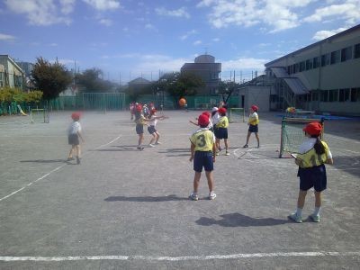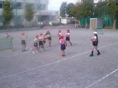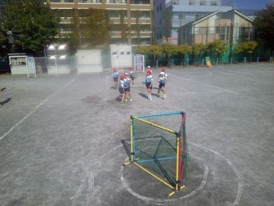 3年生の体育。ボールを使ったゴール型のゲームです。ボールの操作とボールを持たないときの動きがポイント。チームで協力しながらパスをつなぎ、ゴールにボールを入れようと声をかけ合いながらがんばっていました。