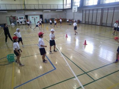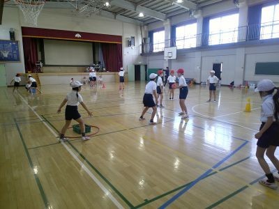 4年生の体育館での体育もゴール型のゲームです。パスだけでなく、ボールを持って少し動けるというルール。学年に合わせた易しい形で、みんなで協力することやゲームをすることの楽しさを感じられるように、と進めていました。