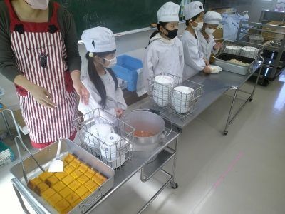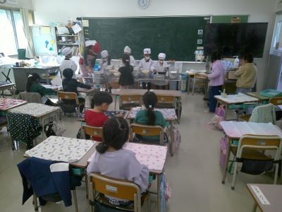 写真は1年1組の給食準備風景。子どもたちはケーキをとても楽しみにしているようで、配られるのが待ち遠しいようでした。