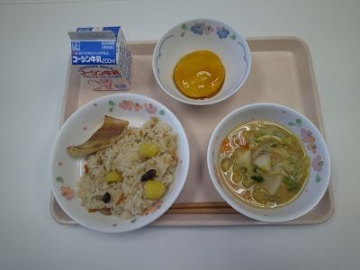 献立は、栗入り炊き込みご飯、赤魚の照り焼き、里芋の味噌汁、お月見みたらしだんご、牛乳でした。