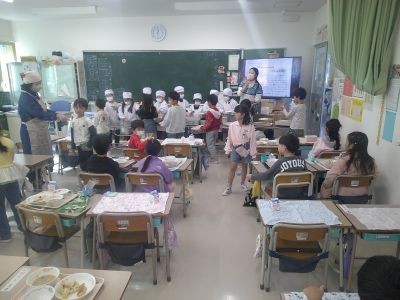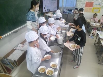 写真は1年3組の給食風景。栗、十三夜のお月見・・・季節を感じる献立を配って準備していました。