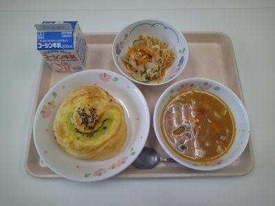 献立は、手作りスイートポテトパン、鶏ささみと根菜のサラダ、ブイヤベース、牛乳でした。