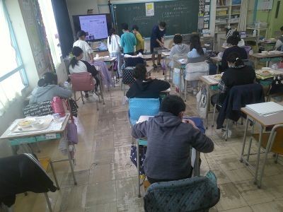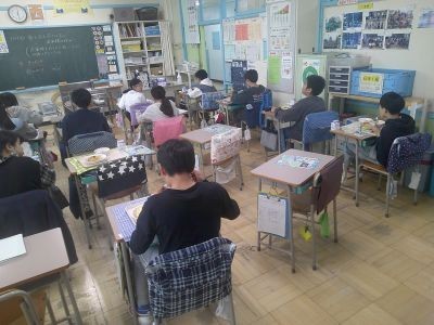 写真は6年1組の給食風景。今が旬のさつまいもたっぷりの手作りパン。魚介の味が広がるブイヤベースなどを味わっていました。