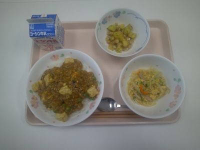 献立は、カレーマーボー豆腐丼、涼伴三糸(リャンバンサンスー)、青のりポテトビーンズ、牛乳でした。