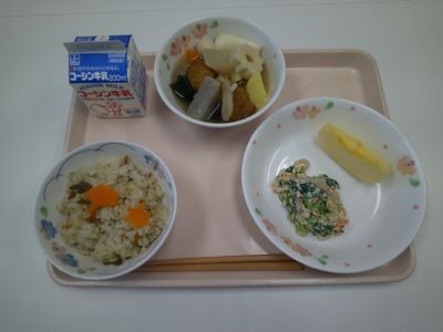 献立は、ふきよせご飯、おでん、小松菜の白和え、りんご、牛乳でした。