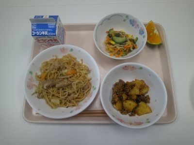 献立は、ソース焼きそば、レバーとポテトの中華揚げ、もやしの中華サラダ、早香みかん、牛乳でした。