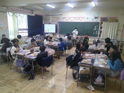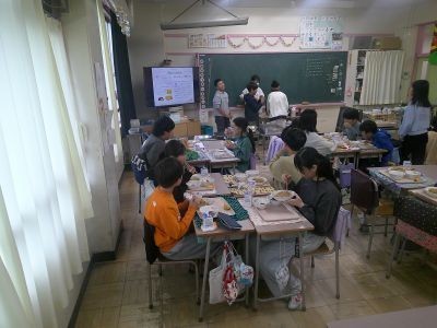 写真は5年1組の給食風景。やきそばをしっかりおかわりして楽しそうに食べている子もいました。