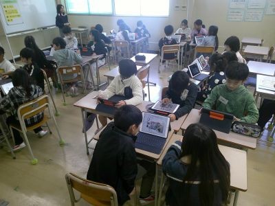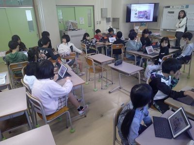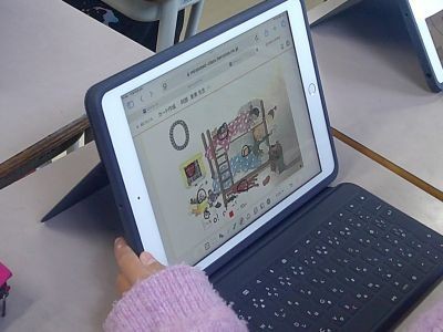4年生の外国語活動。絵をもとにお話をつくるという取組を進めていました。まずは絵を見て、そこに何が描かれているかを英語で確認します。子どもたちからは、book、windowをはじめ、shadow,ostritchなどの発言が続いていました。