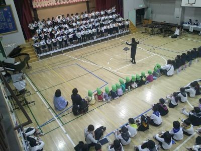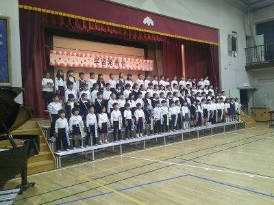 1年生の展示、音楽発表です。展示はいろいろな箱をもとに作った「うきうきボックス」。音楽は、お気に入りの曲を、指揮者をよく見て間違えないようにがんばりたいという意気込みで歌い、演奏しました。
