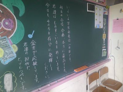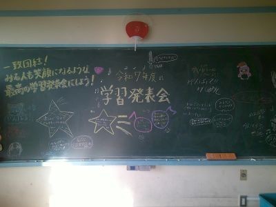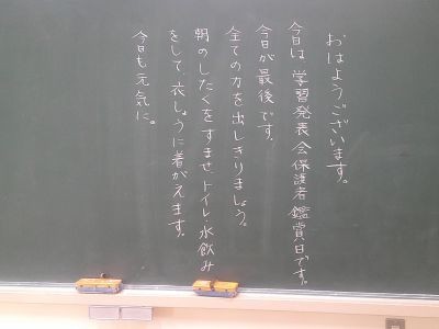 学習発表会2日目は保護者、来賓の皆様を招いての開催。学校内の発表とは違った緊張感が、子どもたちにも教員にもあります。朝、いくつかの教室の黒板には、子どもたちの意気込みや教員からのメッセージが書かれていました。