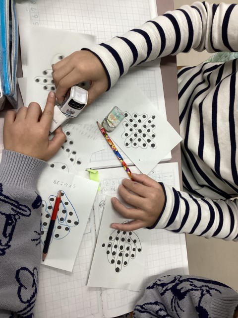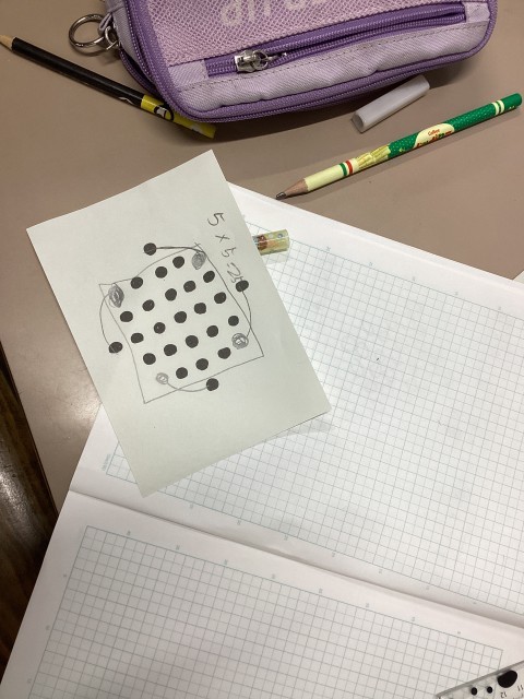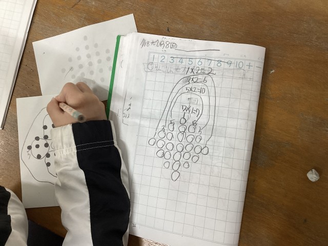 2年生のかけ算の学習です。一見不規則に並んだ丸を数えました。「1、2、3、、、って数えるのはきれいじゃないよね」「ここでまとまりをつくれば数えやすいよ」各々数える中で、「待って!?かけ算でできるかもしれない・・・!」と言った子がいました。その子の気持ちをめあてにし、みんなでかけ算で数を求めました。丸をずらしたり傾けたり分けて考えたり、真剣に取り組んでいました。