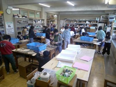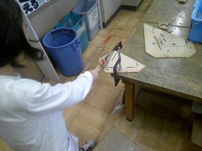 4年生の図工。みんなのこぎりと格闘していました。ギコギコという音が部屋を響き渡ります。薄い板をのこぎりでいろんな形に切り分け、それを組み合わせて作品に仕上げていきます。