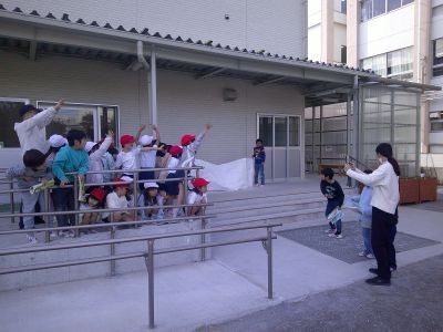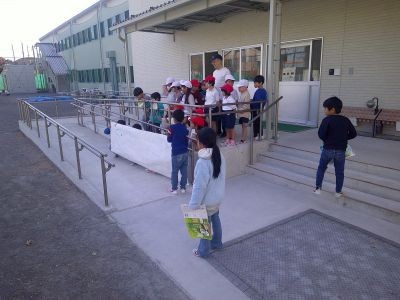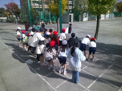1年生が国語で読んできた「くじらぐも」。小学校の屋外での体育の時間の話です。そこで外に出て、描いたくじらを見ながら、お話の場面のように読んでいる学級がありました。こんな様子だったんだろうな、とイメージしながら作品を味わっていました。