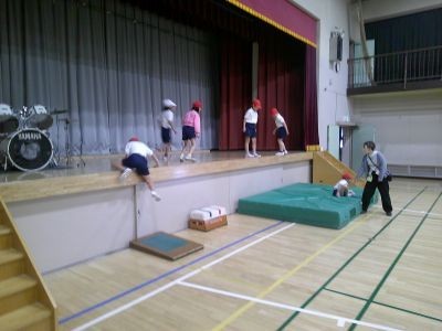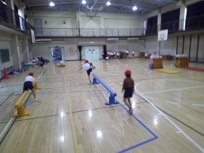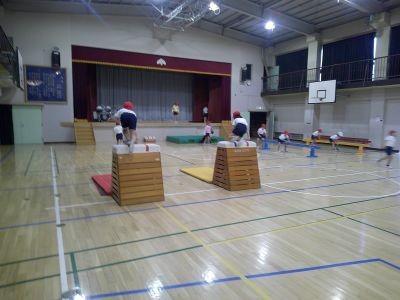 ジャンプしてよじ登ったり、跳び下りたり、跨ぎながら前に進んだり・・・。2年生の体育館での体育。みんなで準備したコースを回りながら、さまざまな動きを行っていました。みんな楽しそうで、どんどん進み、繰り返していました。