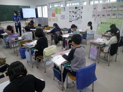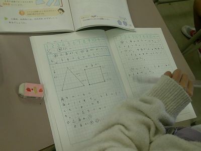 三角形や四角形の頂点とはなにか、それぞれ頂点はいくつあるのか。2年生の算数です。実際にノートに三角形を描き、どの部分が頂点か、いくつあるのかを確かめながら学習を進めていました。