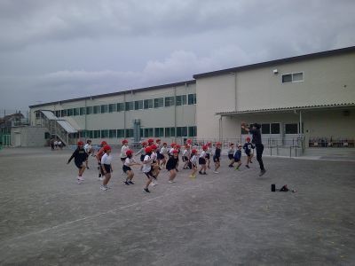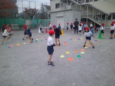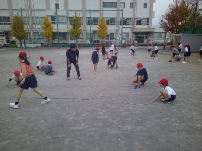 2年生の校庭での体育。まずは音楽に合わせて力いっぱい動き、体を温めます。2本のロープを自分たちで工夫しながら置いてその間を跳び越える。みんなでマーカーや輪をいろいろなふうに置き、そこをリズムよくジャンプ・・・。運動の場を自分たちで考えて活動していました。