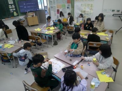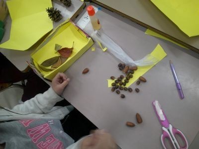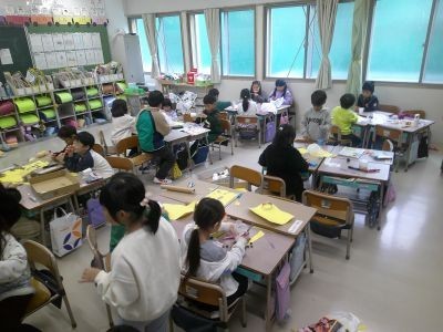 1年生は、先日、生活の学習で近くのお寺に出かけてどんぐりや松ぼっくり、きれいな落ち葉などを拾ってきました。それをもとにしてコマやマラカスを作ったり、飾りにしてみたりという活動を進めていました。子どもたちなりのいろんな工夫があり、楽しそうでした。