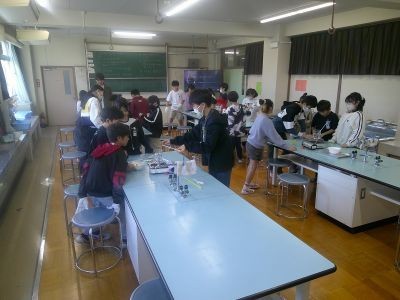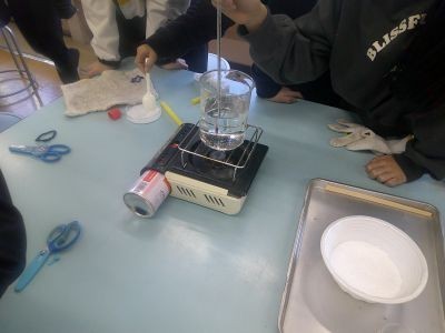 理科で物の溶け方について学習している5年生。その一環でミョウバンを溶かし、オーナメント(飾り)をつくるという活動を行っていました。モールで作った好きな形を70度のお湯で溶かしたミョウバンに付け、お湯に入れて・・・出来上がりは明日です。