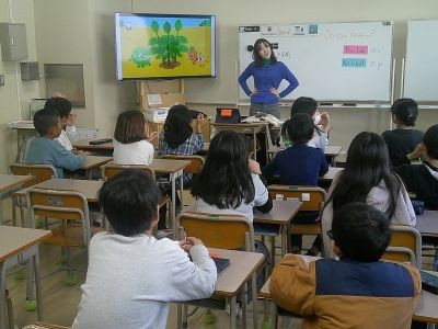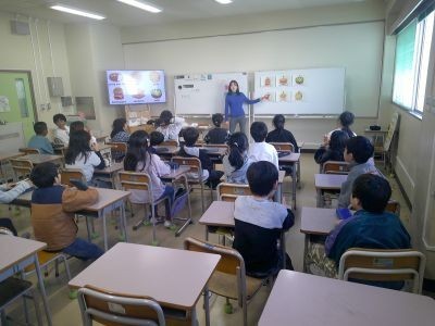 4年生の外国語活動。いくつかの食べ物をもとに「Do you have~?」と尋ね「Yes I do.」や「No I don't.」と答えるやり取りを行っていました。みんなにこにこ楽しそうな会話が続き、さらに英語の歌が流れる映像のクイズなどにも取り組んでいました。