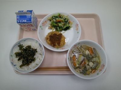 献立は、ご飯、わかめのジュージュー、ひじきの元気コロッケ、小松菜のからし和え、のっぺい汁、牛乳でした。