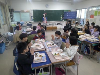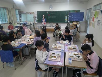 写真は2年3組の給食風景。元気が出るコロッケ、具だくさんの汁などを味わっていました。