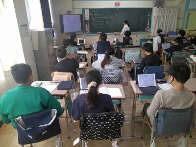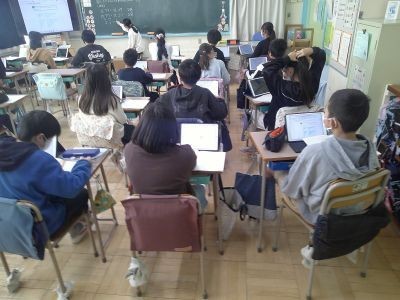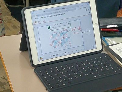 6年生が算数で、いくつかの三角形を見て大きさは違っても形を探していました。そのときの辺の長さの関係がどうなっているかを、比を使いながら確かめていました。比の考え方は拡大図や縮図にもつながっていきます。