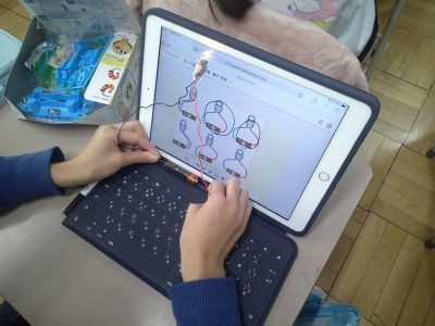 乾電池と豆電球を導線でつないでみると、そのつなぎ方によって電気が点くときと、点かないときがあります。3年生の理科です。どういうときに電気が点くのか、電気の通り道について学習していました。
