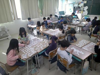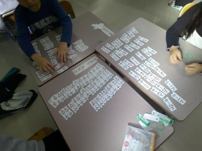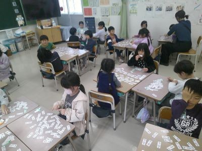 3人グループで1人が「13ー9」のカードを出すと、残りの2人が「4」と答えます。そして、机の上に広がっているいろいろな式の中から「4」の答えの式を探します。「11-7」を見付けたら、その子に1ポイント。1年生の算数はくり下がりのあるひき算の練習です。