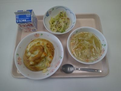 献立は、手作り小松菜チーズポテトロール、ベーコンとキャベツのソテー、鶏肉と野菜のスープ、牛乳でした。