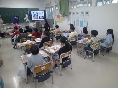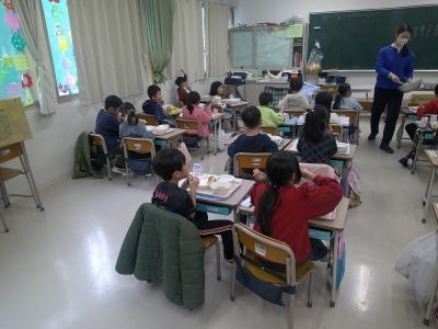 写真は1年3組の給食風景。みんな楽しそうにパンやソテー、スープを口に運んでいました。