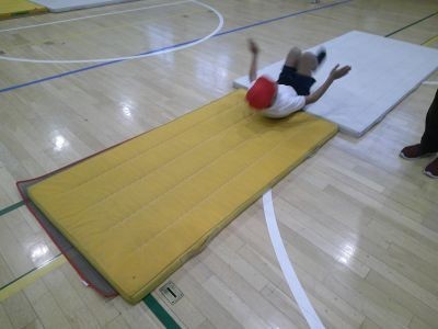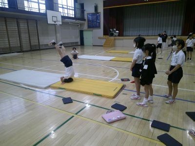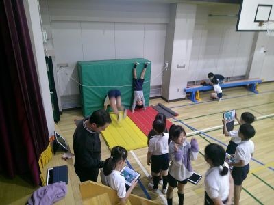 マット運動に取り組んでいる3年生の体育。タブレット端末も使いながら、うまくできるようになるためのアドバイスをし合っていました。「もっと手を遠くについたら」という助言で前転に勢いが出てきた子もいました。