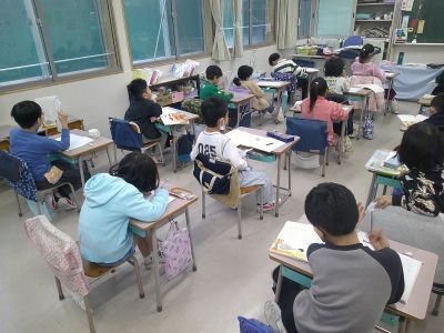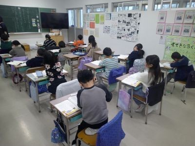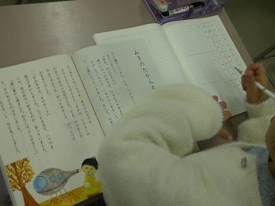 2年生の国語は「みきのたからもの」という作品。この話の内容の大体をつかんでいくために、どの場面で、誰が、何をしたか、どういう出来事があったか、についてノートにまとめていました。