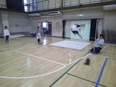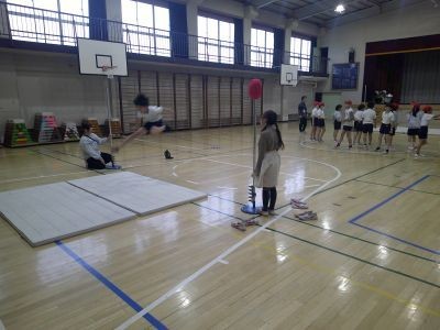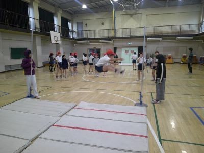 走り高跳びのバーのかわりにゴムひもを張り、自分で決めた高さを跳び越えるようチャレンジしていました。4年生の体育です。ゴムひもなので恐怖感が少なく、思い切り挑んでいました。