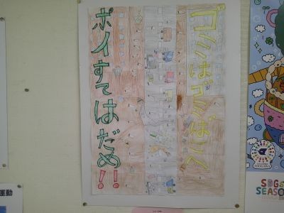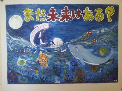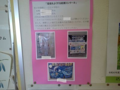 江戸川区の環境をよくする絵画コンクールで、3年生と6年生の作品が区長賞を受賞しました。学校でも表彰するとともに、作品を昇降口前に掲示しています。また、先日まで松江図書館にも掲示されており、それをご覧になった地域の方が、その様子を写した写真を学校へ届けてくださいました。みんなのよい刺激にもなっています。