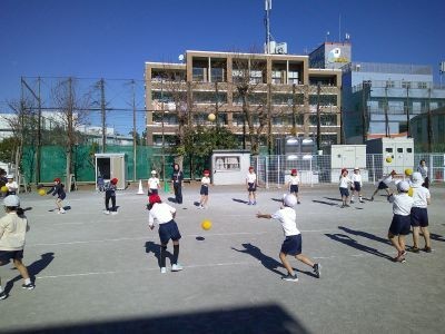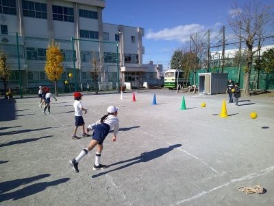 2年生の校庭での体育はボールを使った運動。友だちとキャッチボール。だんだん間の距離を長くして、相手にとってもらえるように投げます。次は的当て。目標のコーンを思い思いの投げ方で狙って投げていました。
