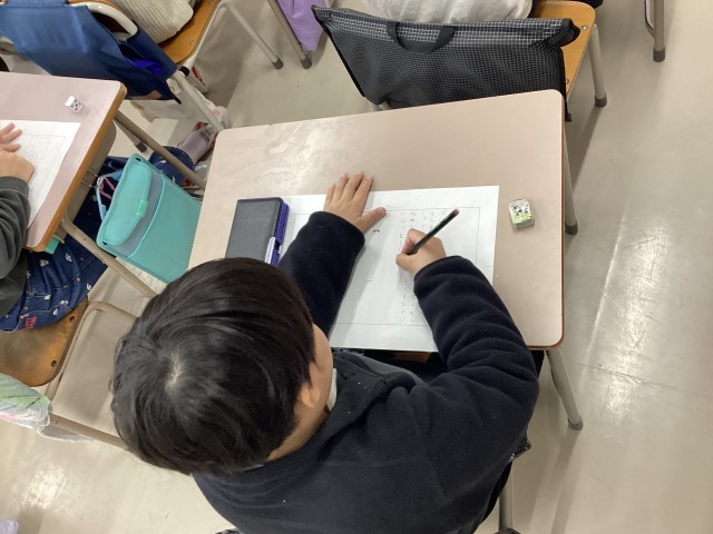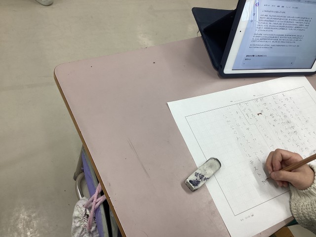 2年生は、「2学期にがんばったこと・3学期頑張りたいこと」というテーマで作文を書いています。AIが文を書くのが上手なことは知っているので、「AIに作文書いてもらいたい!」という子が多くいました。プロンプトをみんなで考え、作文を書いてもらいましたが、「つまんない」「だれでも書けそう」などの感想でした。じゃあどんな作文が良いのかな?と尋ねると、「思い出」「したこと」「気もち」「ともだちと話したこと」などの声があがりました。一人一人がAIには書けない作文を仕上げました。