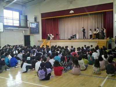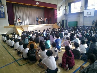 今朝の集会委員会の子どもたちによる児童集会。予め録音されている教員の歌声。それが誰かを当てるクイズです。正解発表後、その教員がステージで実際に歌いました。伴奏の教員や曲に合わせてダンスを披露する子などみんなで盛り上がり笑顔で一日をスタートしました。