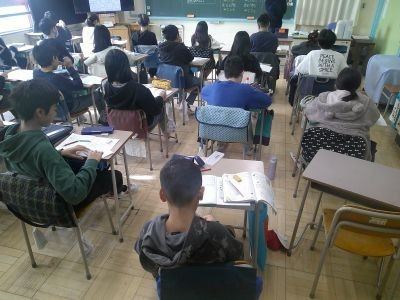 6年生の算数は拡大図と縮図の学習。大きさが違うさまざまな多角形の関係を調べていくと、正多角形はそれぞれすべて拡大図と縮図の関係になることに気付きました。では、円はどうなるか?辺や角がないけれど・・・と授業が進んでいました。