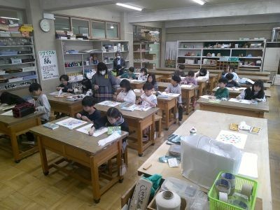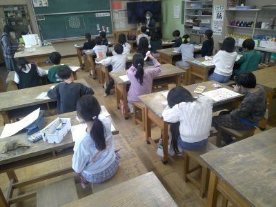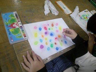 画用紙に、何色かのクレヨンで丸い形を描いていきます。それをティッシュペーパーでこすると、ぼわっとした感じになってきます。3年生の図工です。淡い感じがなんだか温かくほのぼのとした感じを出していました。