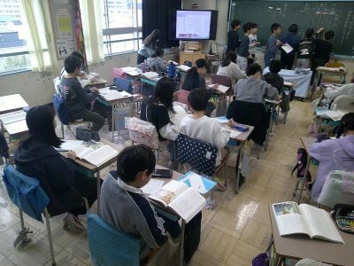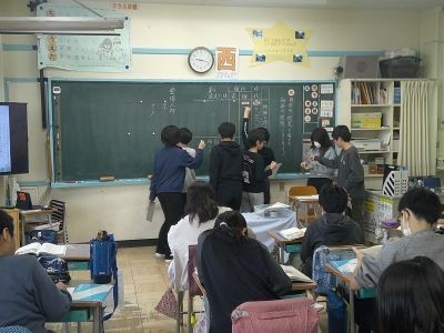 国語で「ぼくのブック・ウーマン」という作品を読んでいる6年生。この物語に描かれている時代、国、場所、登場人物などをそれぞれで読み取り、それを黒板に集約して話の内容を整理している学級がありました。みんなの力で読み深めていきます。
