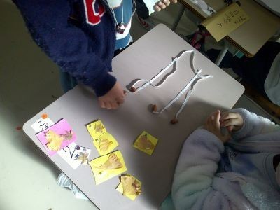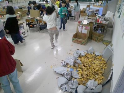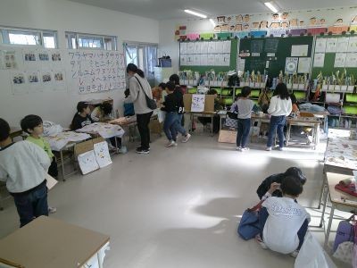 1年生が学年合同で秋まつりをしていました。半分の子どもたちは落ち葉やどんぐりなどを活用した手作りのお店を開き、半分の子どもたちはこども銀行のお金を手にしてお客さん。途中で交代して、みんなでたくさん楽しみました。