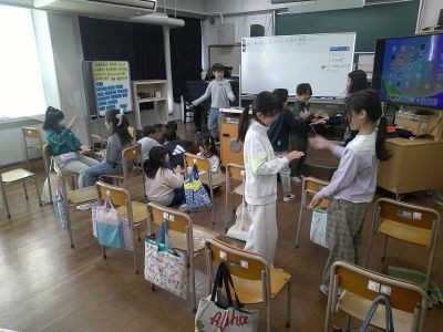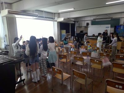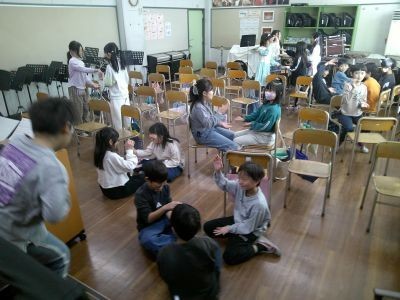 「十五夜さんのもちつきは トーン トーン トッテッタ・・・」。3年生が音楽で手遊び歌を楽しんでいました。友だちとペアになり、手を合わせるなどして歌います。曲のスピードが速くなると盛り上がりも増していました。