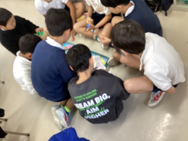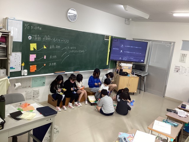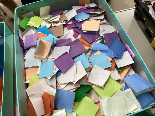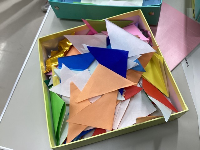 おりがみをおると、正方形や長方形、直角三角形ができました。2年生の学習です。それらを切ってもようをつくろうとしています。算数の学習を活かして、来週のお楽しみ会の飾りづくりです。どんなもようができるか楽しみですね。