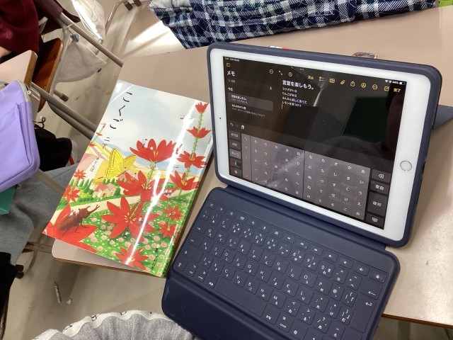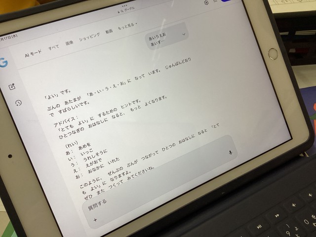 2年生の国語の学習です。文のはじまりが「あいうえお」や「かきくけこ」になった文を書いています。みんなで「とてもよい文」「よい文」「う〜ん・・・の文」の基準をきめ、プロンプトとしました。書いた文をAIに見てもらうと、「とてもよいって言ってくれた!」「AIのアドバイス、たしかにな・・・」「このアドバイスより、自分でもう1回考えたい!」すぐにアドバイスをもらうことができ、学習がどんどん進んでいました。