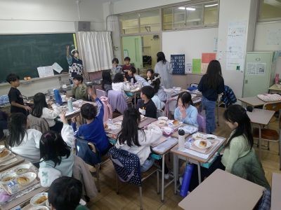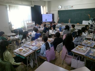 写真は3年2組の給食風景。6年生が考えてくれた子どもたちに人気の品を取り入れたメニュー。おかわりの手がたくさん挙がっていました。